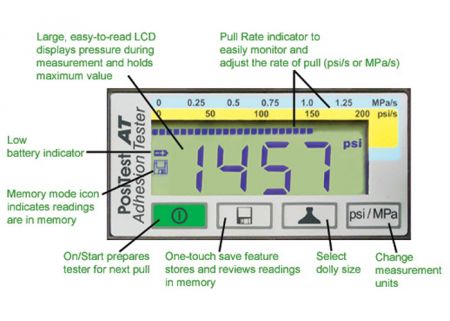 The norm for adhesion testing prescribes the maximum pull rate, pulling too fast results in incorrect measurements. The adhesion tester is equipped with a pull rate indicator preventing the user from pulling the coating from the material too fast.
