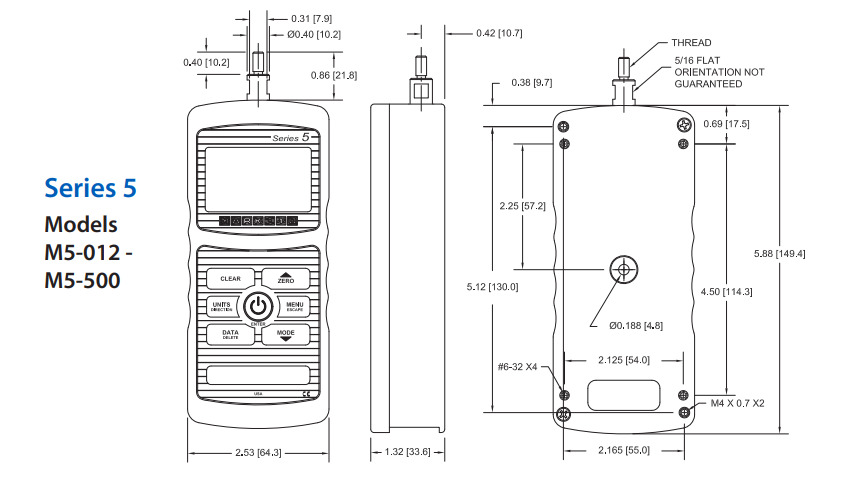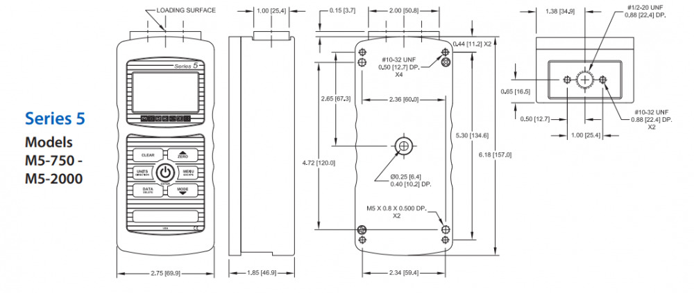 Series-5 Force Gauges models M5-012 tot M5-500 have a different housing size from the larger models.
