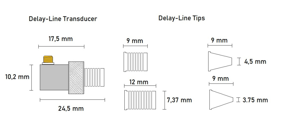 Interchangeable delay-line tips are available in multiple sizes to suit different materials and inspection needs:
